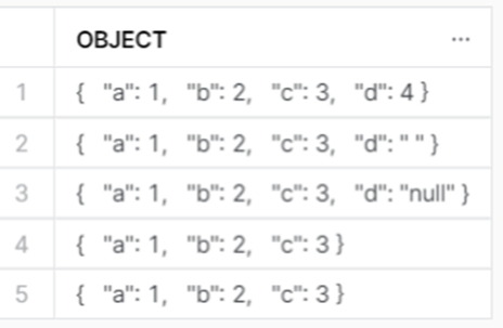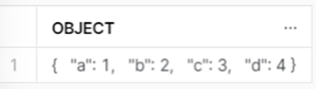 SELECT OBJECT_INSERT(OBJECT_CONSTRUCT('a', 1, 'b', 2, 'c', 3), 'd', 4);