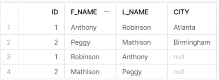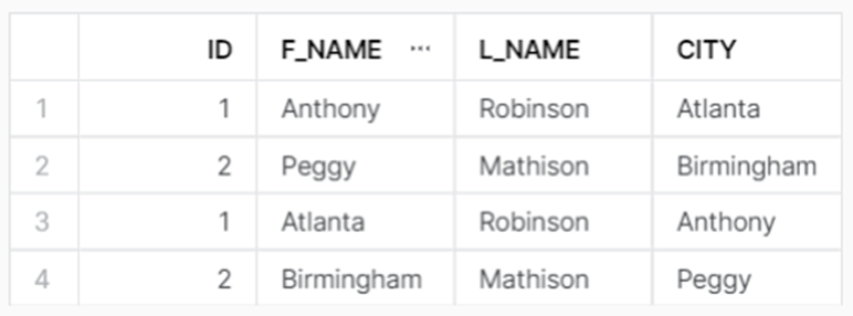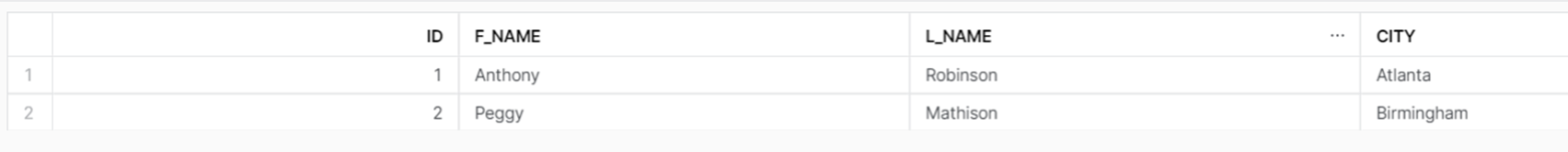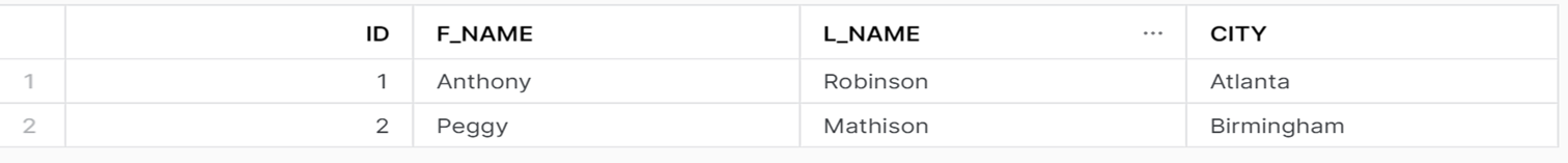 VALUES (1, 'Anthony', 'Robinson', 'Atlanta'), (2, 'Peggy', 'Mathison', 'Birmingham');