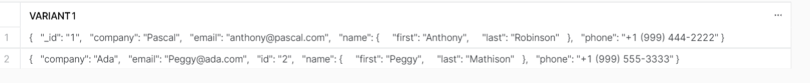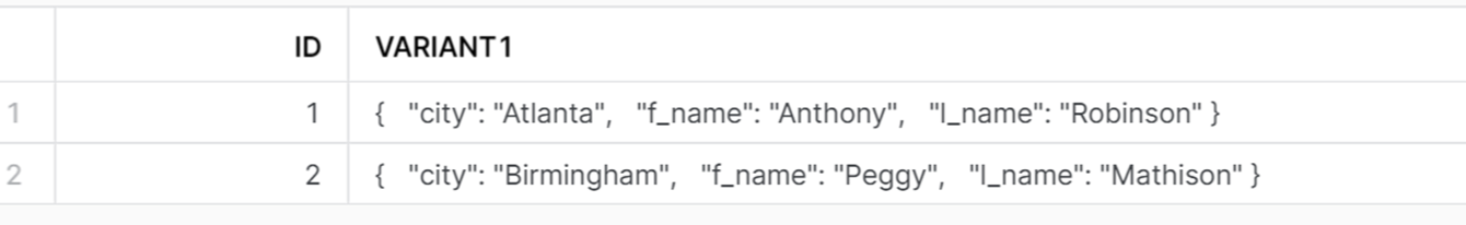 SELECT 1, parse_json(' {"f_name": "Anthony", "l_name": "Robinson", "city": "Atlanta"} ');